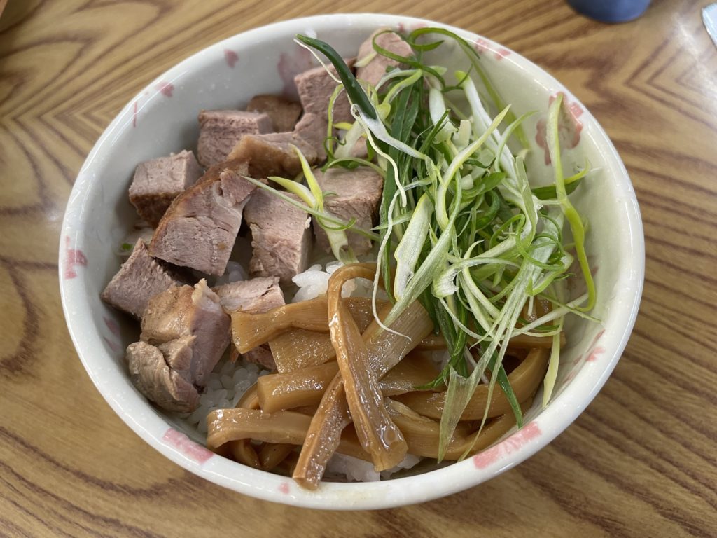 タレとご飯とチャーシューとネギとメンマ、これらを和えて口の中に放り込むと、ひと噛みする度に幸せが口の中に広がります。